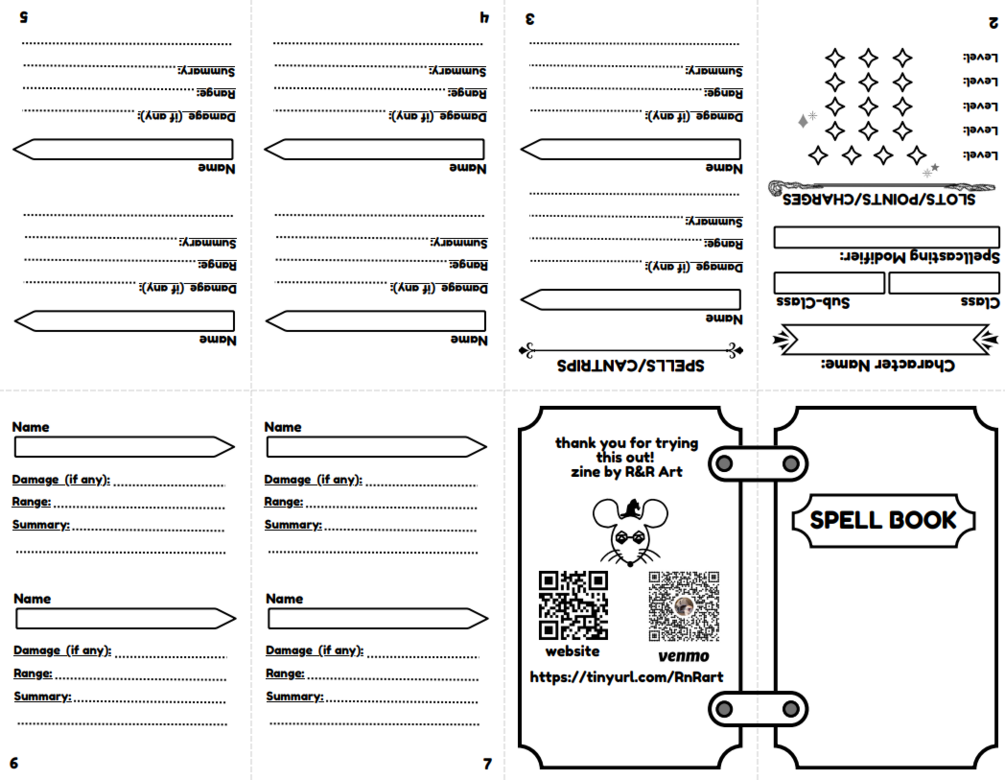 Enjoy this spellbook by 1. printing and folding it according to 1-page zine instructions (such as this tutorial from Outlet PDX) and then 2. filling in your Dungeons & Dragons character's spell/cantrip information!